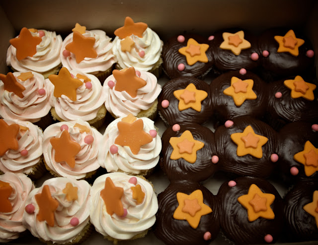 The first is for a hair client of mine: one of my oldest and most faithful. She is a nurse in an ICU, and from what I can tell her hospital is implementing a new program- or maybe just her floor- I dunno. All I do know is that she needed some cupcakes with stars atop them, and I told her I would deliver.