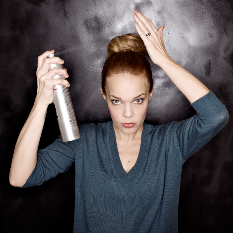 Now, to finish- use a very, very good hairspray, and spray it in the direction of the bun. Wait for 5 seconds, and use your hands to smooth in the direction of the bun. Continue and do the back and sides of your hair.